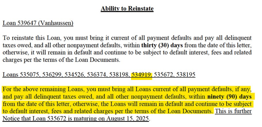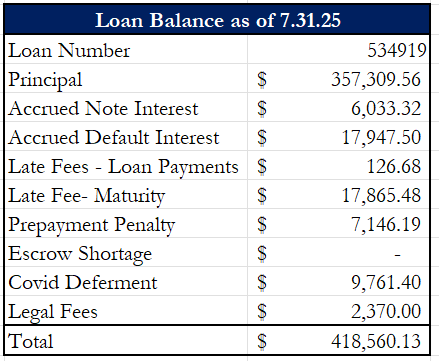 FCB confirmed the loan was in default due to payment and non-payment defaults. They gave the borrower 90 days to cure before accelerating the loans. Per County records, the code violation lien specific to loan 534919 was released on July 23, 2025, within the 90 days. However, other code violations remain, and as previously noted, the loans have cross-default provisions.
