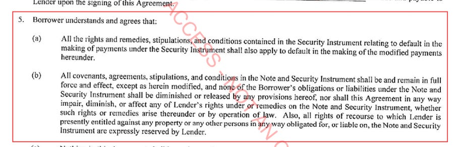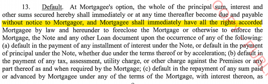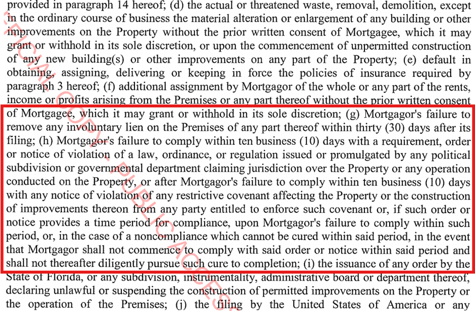 Based on just the Modification Agreements, I don’t think VQ has much of an argument. The lender clearly reserved their rights. However, we need to review the notice provisions in the loan documents. If the loan documents required formal notice, and it was not given, then the lender cannot apply the default interest back to the code violation date. More to come on this.