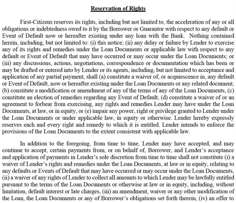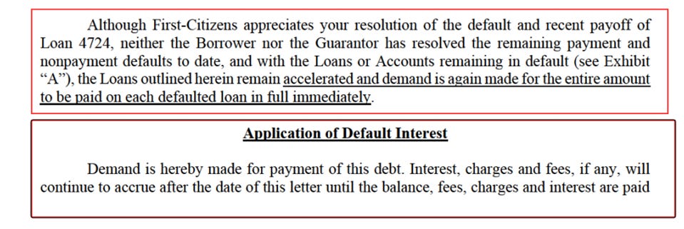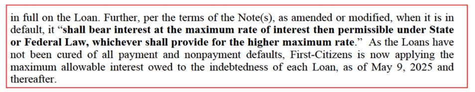 There is one line in the demand letter I would point to if I were VG. “First Citizens is now applying the maximum allowable interest owed to the indebtedness of each Loan, as of May 9, 2025, and thereafter.” This is a decent argument that May 9th is the default date, but CNP can point to the reservation of rights clause in the demand letter: