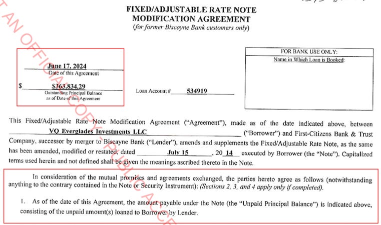 Onto the Modification Agreement. There are two key sections. VQ will point to page one and argue FCB verified the outstanding amount due as of June 17, 2024. It included just the Principal Balance.